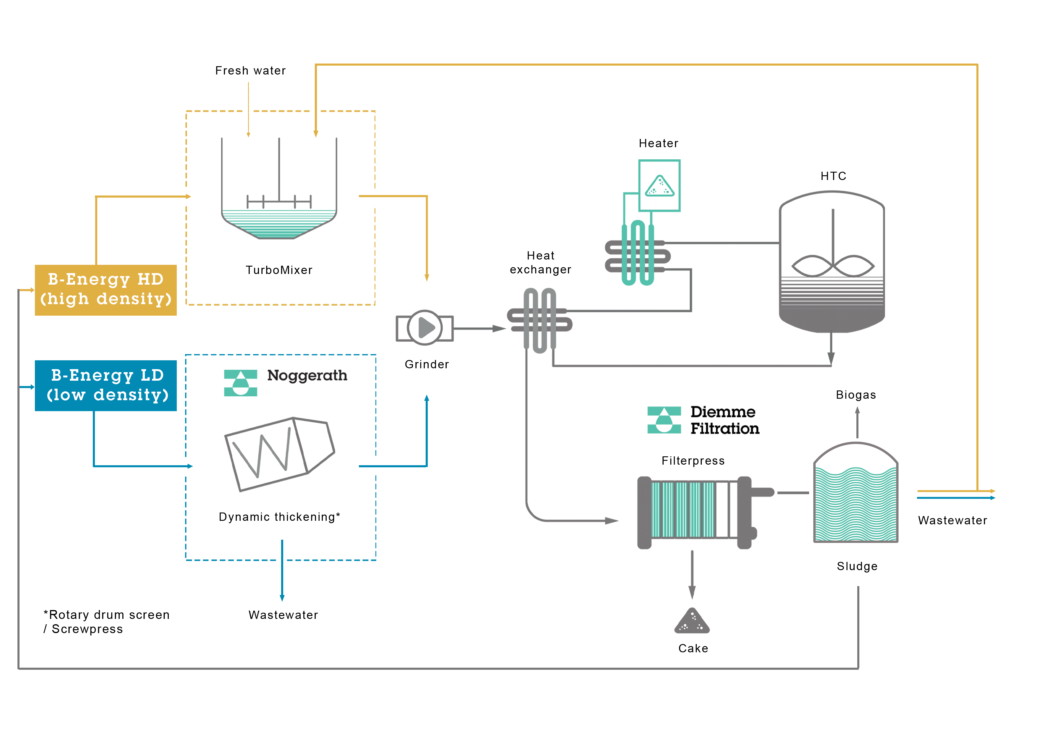 B-Energy Low Density, che tratta fanghi diluiti (indicativamente [TSS] < 10%), è caratterizzato dalla presenza di una stazione di pre-concentrazione che permette di ridurre i volumi da gestire nella fase a caldo (HTC) e in quella di separazione solido-liquido con filtro pressa, per un efficientamento energetico globale.