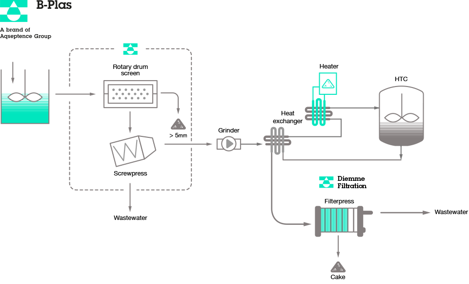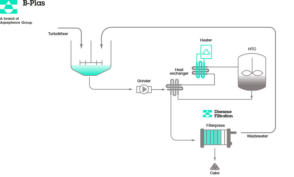 Il sistema B-Sludge (modulo fanghi) consente di trattare fanghi organici in ingresso diluiti, concentrati o disidratati, in un range operativo di Solidi Sospesi Totali dall’1% al 30% o più, equalizzandone la concentrazione mediante pre-trattamenti meccanici. Il fango pretrattato viene inviato al processo di carbonizzazione idrotermale (HTC) nelle condizioni fluidodinamiche ottimali e, successivamente, alla separazione solido-liquido mediante filtropressa, operante senza uso di polielettroliti.